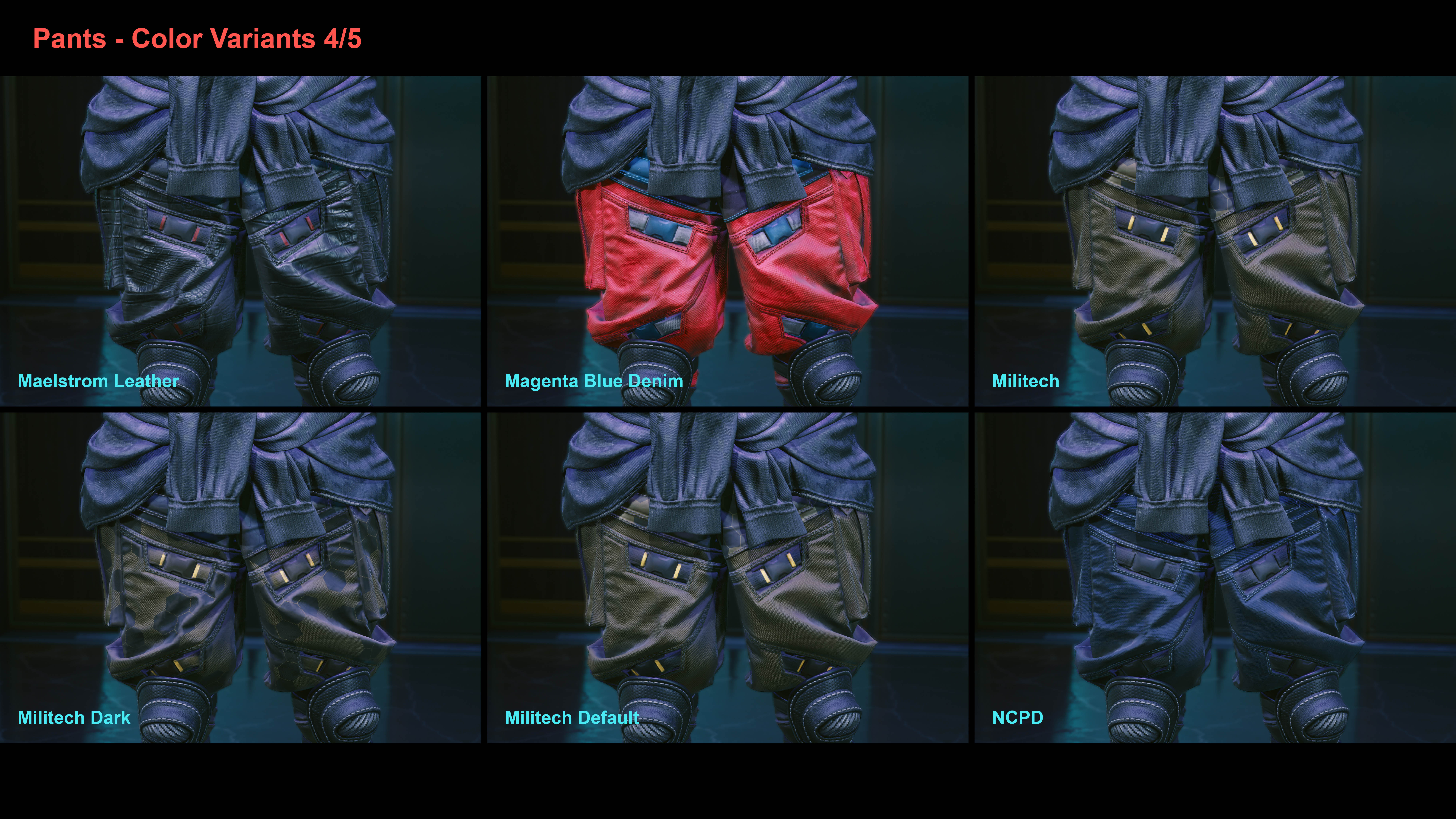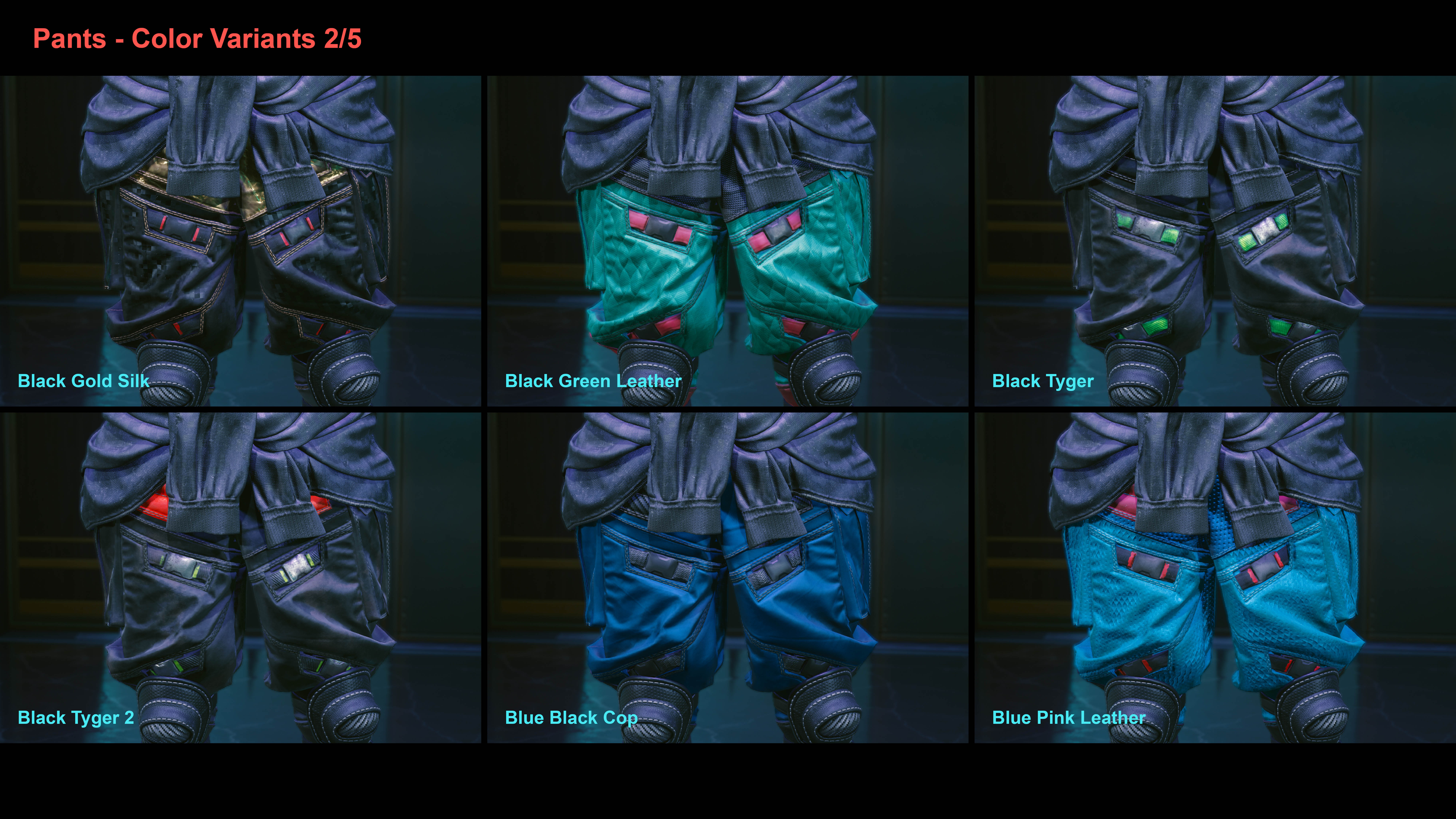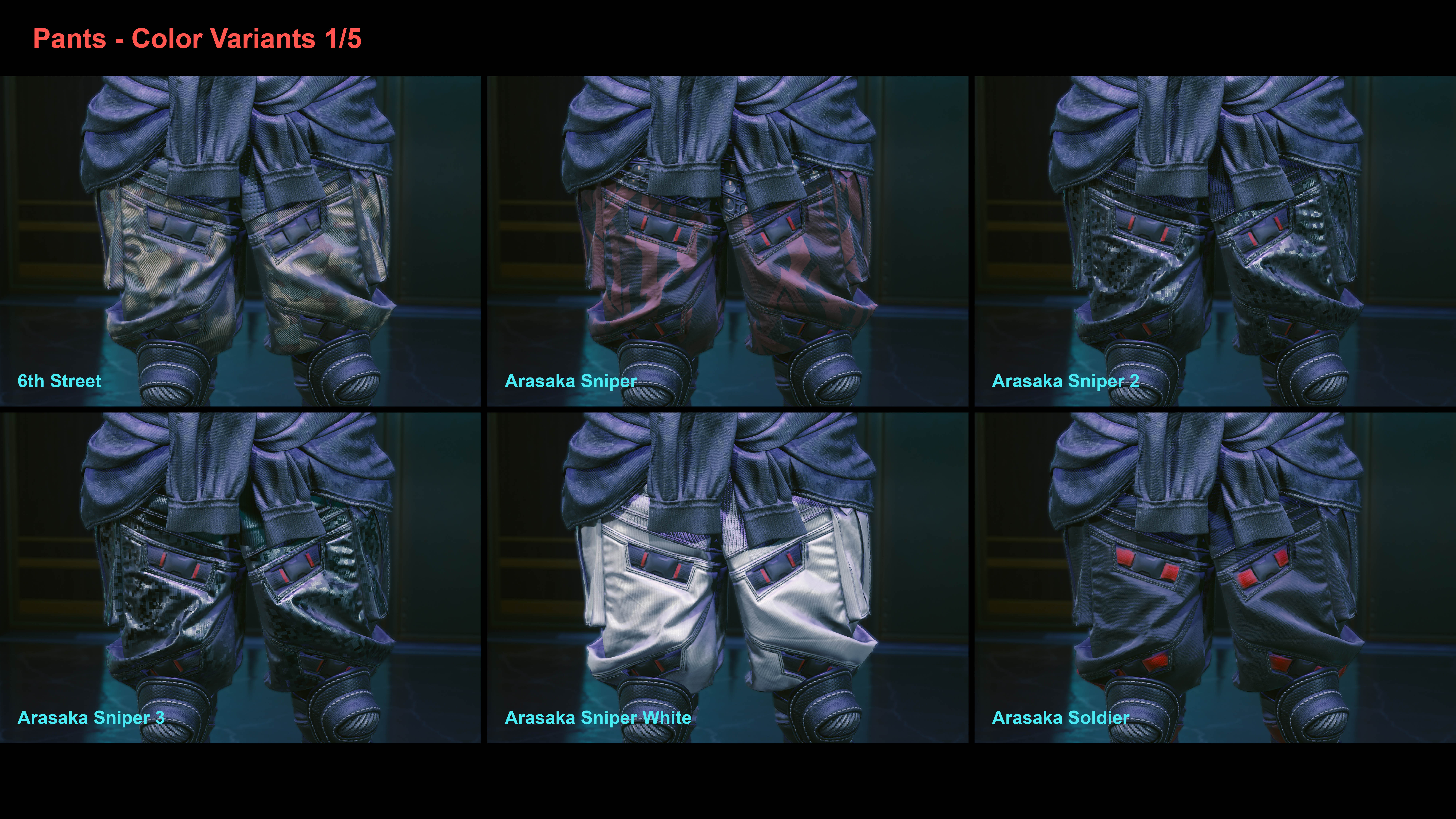 Introduction:Added a combination of pants and shoes worn by Tyger Claws for the female V. Many different color variants and decals are available.Code:Game.AddToInventory("Items.Q005_Johnny_Pants",1)Game.AddToInventory("Items.Pants_08_basic_01",1)Game.AddToInventory("Items.Pants_14_basic_01",1)Game.AddToInventory("Items.Q005_Johnny_Shoes",1)Game.AddToInventory("Items.Boots_01_basic_01",1)Game.AddToInventory("Items.Boots_10_basic_01",1)Author: EchorraInstall:The path of the mod folder is... \ Cyberpunk 2077 \ archive \ pc \ mod If it does not exist, create a mod folder.Steam:\SteamLibrary\steamapps\common\Cyberpunk 2077\archive\pc\modGOG:\GOGLibrary\Games\Cyberpunk 2077\archive\pc\modEpic:\EpicLibrary\Cyberpunk 2077\archive\pc\mod