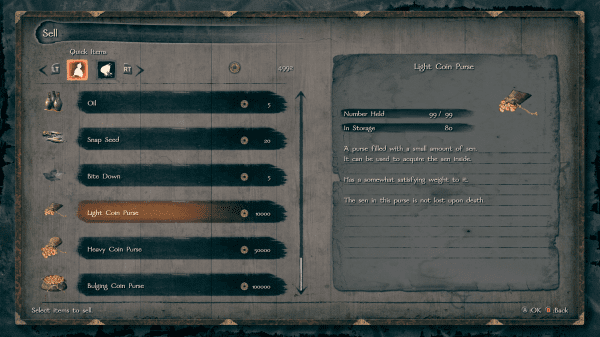 Heavy Coin Purse sells for 50,000 [must be sold to vendor - still consumed for normal amount] {EquipParamGoods -> 3704 -> sellValue = 50000}