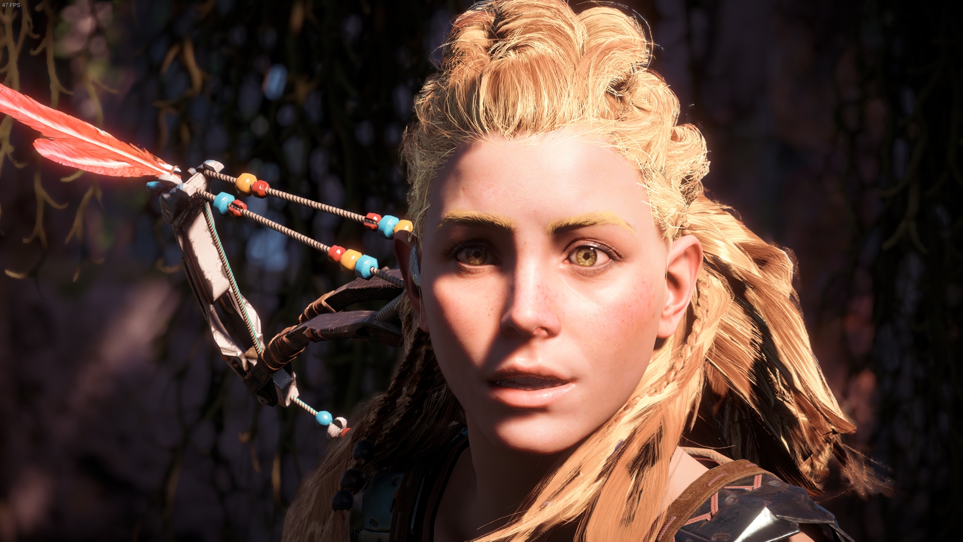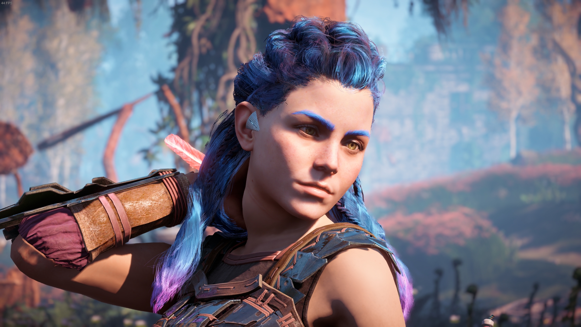 can't fix because the eyebrows are directly on Aloy's face texture at that distance.