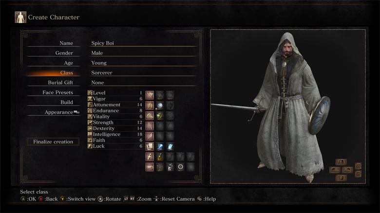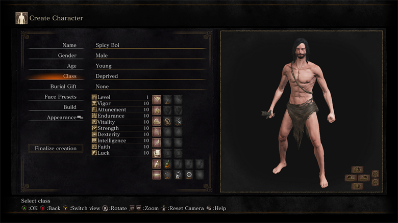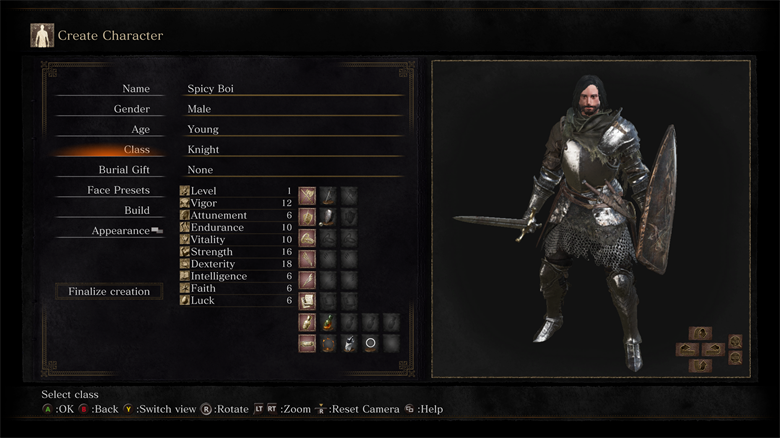 Extremely diffcult early game, which pays off later with more items and souls provided than any other class. (Note: Remember to 2-hand Broken Straight Sword during the first boss for that extra bit of damage.)